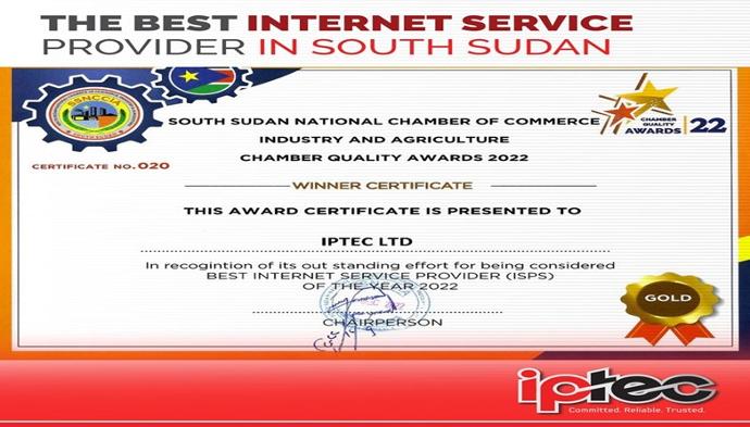 We are pleased to announce that IPTEC has been honored with the prestigious title of Best Internet Service Provider 2022 in South Sudan by the esteemed South Sudan Chamber of Commerce. We extend our heartfelt gratitude to our esteemed clients, colleagues, and stakeholders for their unwavering support, which has enabled us to achieve this remarkable feat.
